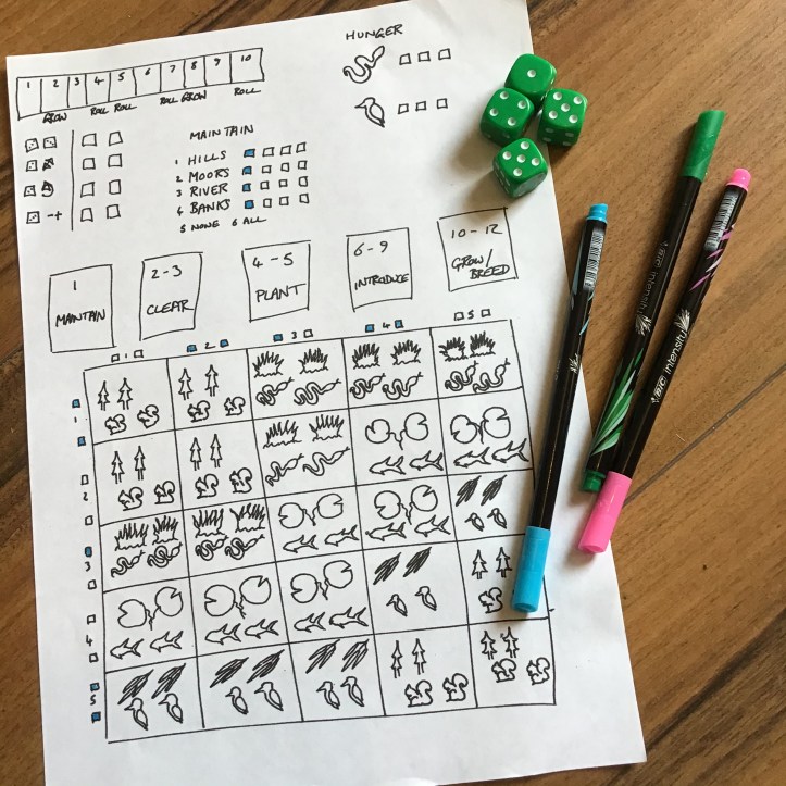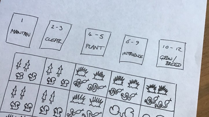 On the selection panel, “maintain” protects against possible damage. “Plant” means that you can roll two dice and colour in one of the plants the square with that row/column combination — assuming, of course, that both the row and the column have already been cleared. “Introduce” means that you can add wildlife to the squares which you have planted. “Grow” and “Breed” are the same, but the former is for plants and the latter for wildlife: if a square has one plant/animal coloured then colour the other plant/animal, and if it has both plants/animals coloured then colour one plant/animal of a square next to it.