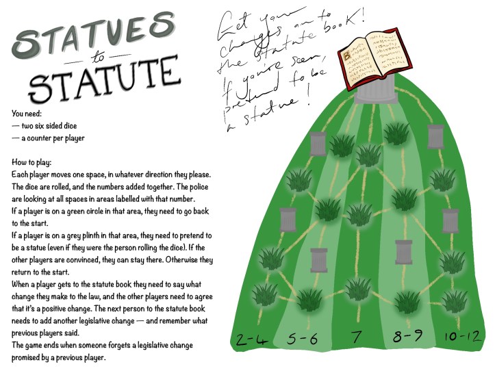 I created this game in a fit of (quite understandable and fully justified) anger. It needs palyers to find a counter per player and two six-sided dice (or a dice app). The dice are not the player’s movements, but represent where the police are looking. Each player moves a space in whatever direction they wish. The two dice are then rolled and the numbers added together – that’s the area the police are looking at. Any players in that area on a green grass blob need to return to the start, but any players in the area on a grey plinth can pretend to be a statue. Once a player reaches the book at the top they get to suggest a legislative change. The next person to the top needs to add a new legislative change and remember the previous suggestion, and so on until someone forgets what legislative changes had been suggested. I’m not sure this is a particularly good game as it stands, but it certainly got me thinking.