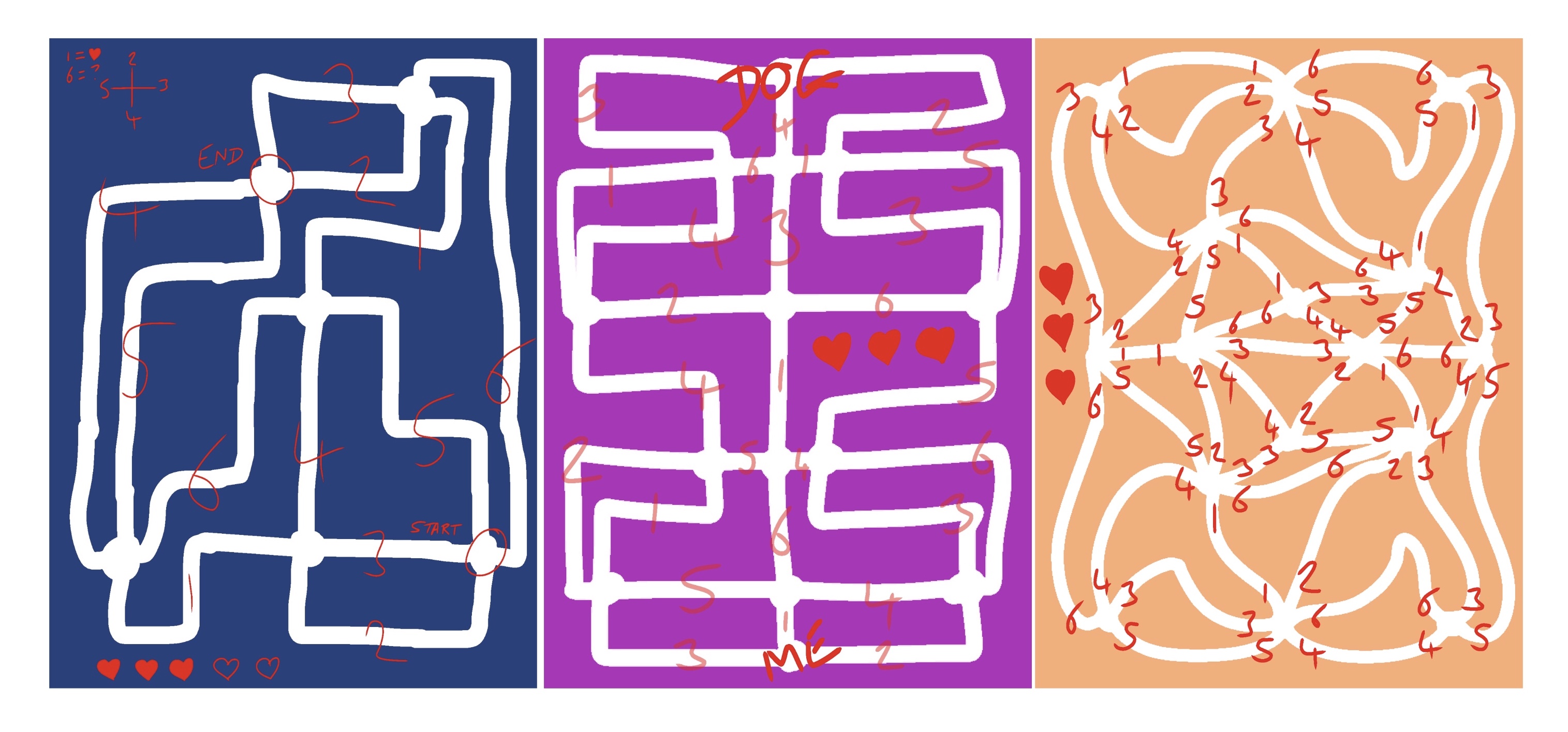 Over the last year I’ve been playing around the idea of games on greetings card, releasing two sets of designs — one set of five Christmas cards, and one set of two different Valentine’s Day cards. Some of these cards are available to buy on Etsy, and the Roll & Colour cards have QR codes on the back which lead to explanation videos.