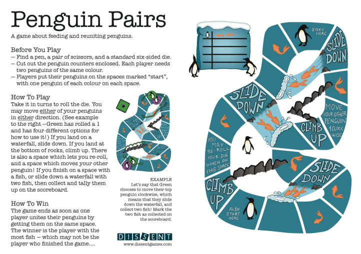 Penguin Pairs. 2-4 players. A race game round a track. Each player has two counters (included inside), and needs to get them both on the same space, while collecting points. Very popular as a Christmas card, especially for small children. Easy.
