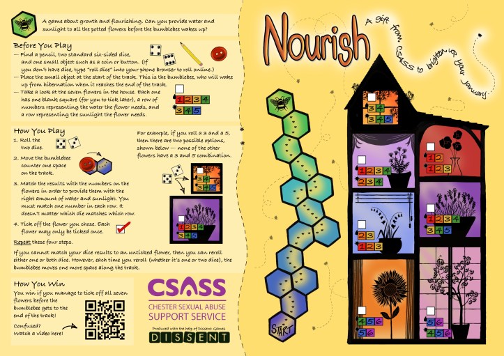 Nourish. 1 player. Race against time with dice. Bees and flowers themed, with a particularly bold colourful design. A proportion of profits from this game go to the Chester Sexual Advice Support Service. Medium.