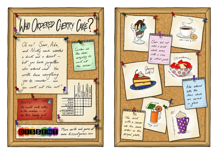 Cherry Cake. 1 player. This is a simple logic grid, where you need to read the clues on the card (some in text, some as the picture) and work out the answer. This card is simple, so you may not even need the grid at all. Easy.