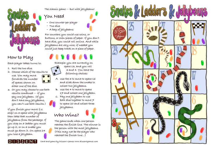 Snakes & Ladders & Jellybeans. 1-5 player. Just like snakes and ladders, but you roll two dice and choose which to use — and the winner is the person who collects the most jellybeans! An excellent card to give to a children on their birthday. Easy.