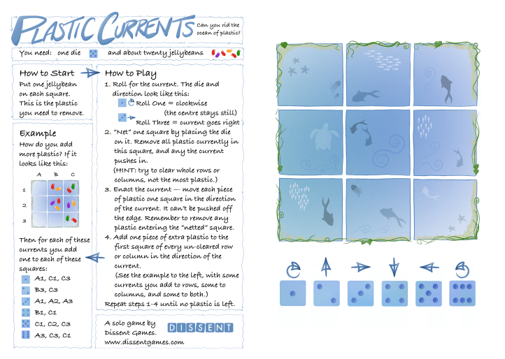 Plastic Currents. 1 player. Puzzley game involving dice and moving jellybeans around a grid. Place the jelly beans (plastic in the ocean) on the grid, then roll for the current. You get to net and remove some plastic, but more appears in uncleared rows or columns… Hard.