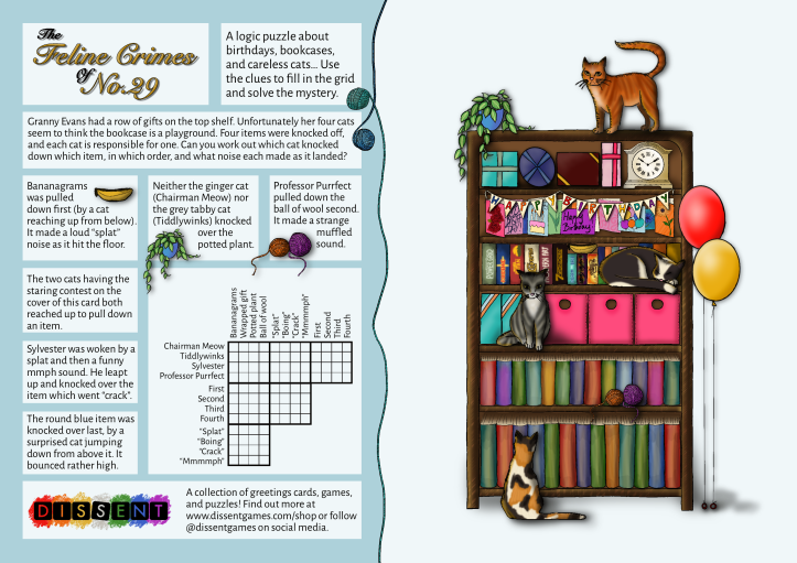 The Feline Crimes Of No.29: Birthday Bookcase. 1 player. Another logic grid about the same cats. Which cat knocked which item over, in which order, and what noise did it make when landing? Says “Happy Birthday”. Takes about 10 minutes. Hard.