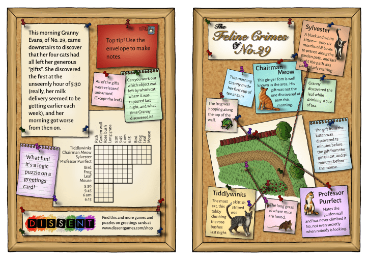 The Feline Crimes Of No.29: Garden. 1 player. A harder logic grid about the same cats. Follow the clues to deduce which cat left which “gift” from which location at which time. Takes most people about 10 minutes to complete. Hard.