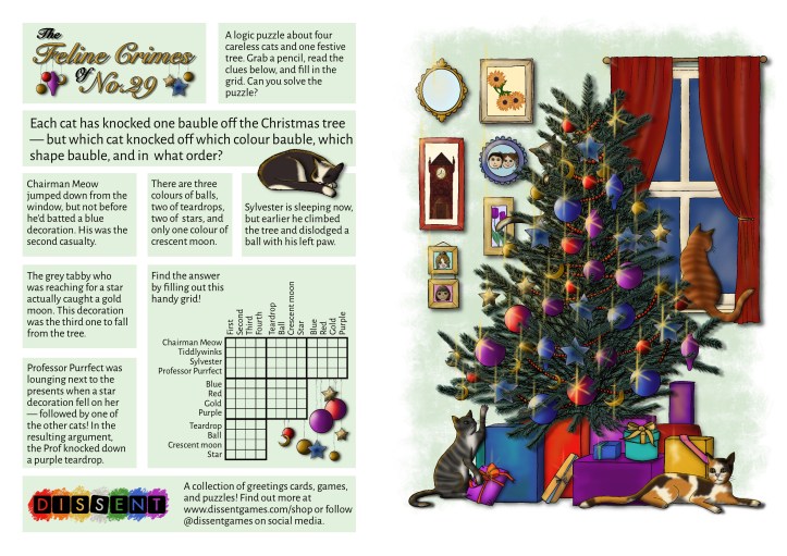 The Feline Crimes Of No.29: Cats at Christmas. 1 player. A logic grid about four cats. Which cat knocked which shape and colour bauble from the tree, in which order? Takes about 10 minutes. Medium-hard.