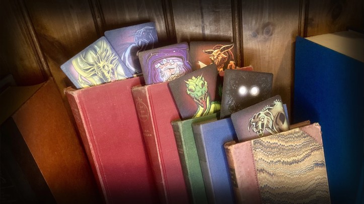 The game is set in a cursed library, where a long-suffering Senior Librarian keeps finding escaped literary terrors roaming the shelves. You are the library apprentices, and you have been set a number of different challenges. Who will be the first one to capture the Kraken, Fenrir, or Grendel’s Mother? Or terrors with specific symbols? Or use a fictional object? Each challenge is worth points, as are the terrors themselves. You’ll have both public challenges for which everyone competes (pale green cards), and private challenges which you’ll score only for yourself at the end (pink cards).