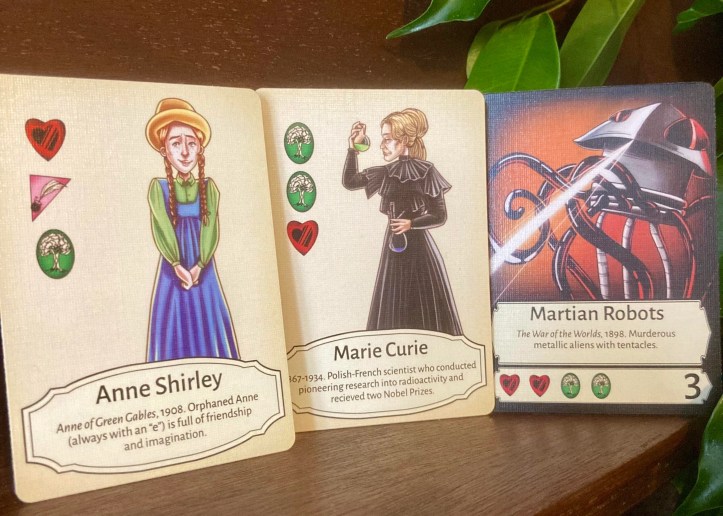 Draw book characters into your hand, looking for the right combination of symbols which will allow you to capture the terrors currently visible in the middle of the table. You’re after Martian Robots? That’s two red hearts and two green ovals, please. Luckily Anne of Green Gables and Marie Curie have you covered, swooping in with a simultaneously excitable and no-nonsense approach!