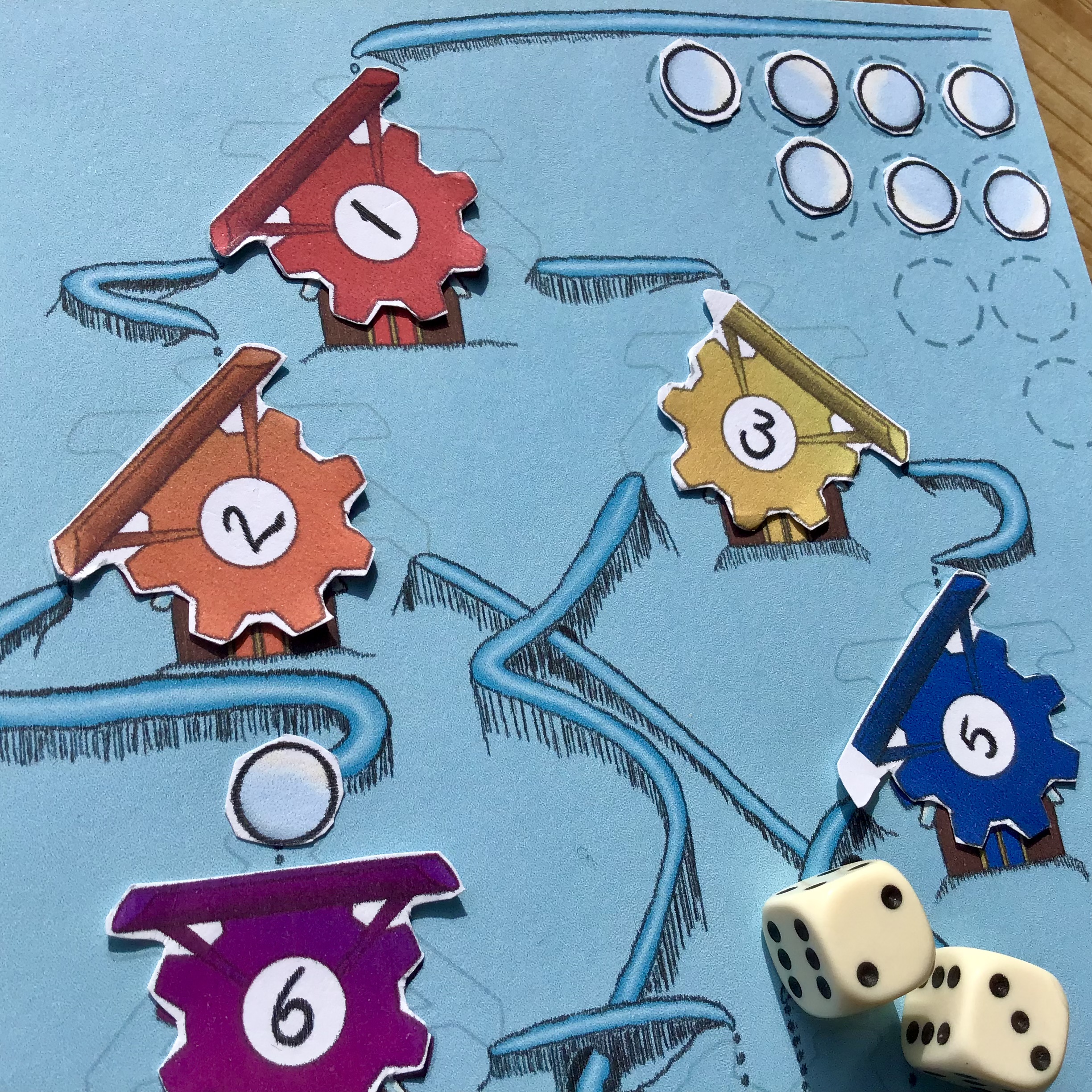 This is an easy to play and easy to understand game. It’s a greetings card first and a game second. It’s suitable for children and adults alike, and is played using counters included in the card. All you (or the lucky people to whom you send the card) need to find is some scissors and two standard six-side dice. If you don’t have any dice, it’s easy to roll a D6 online.
